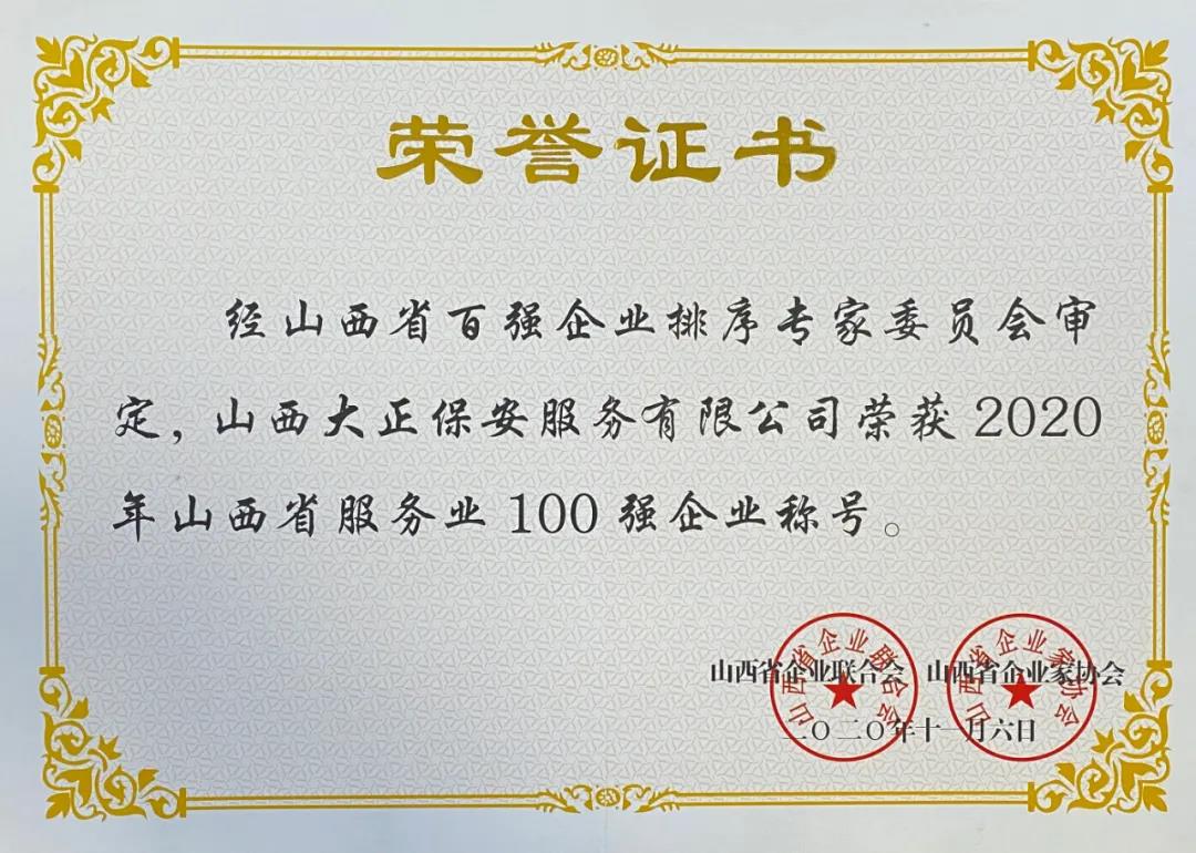 11月6日,以“勇于擔(dān)當(dāng)奉獻(xiàn)、彰顯企業(yè)家精神、促進(jìn)變革中的大企業(yè)發(fā)展 ”為主題的2020年山西企業(yè)家活動日暨山西企聯(lián)第28次年會及2020年山西企業(yè)100強(qiáng)發(fā)布會在太原舉行。山西大正保安服務(wù)有限公司榮膺“2020山西服務(wù)業(yè)企業(yè)100強(qiáng)”、“2019年度功勛企業(yè)”兩項(xiàng)榮譽(yù)稱號;公司黨委書記、董事長張躍生榮獲“2019年度功勛企業(yè)家”。公司黨委副書記、總經(jīng)理趙培宏,黨委副書記、副總經(jīng)理陳志平前往參會。趙培宏作為獲獎(jiǎng)企業(yè)代表上臺領(lǐng)取“2019年度功勛企業(yè)”獎(jiǎng)項(xiàng)。