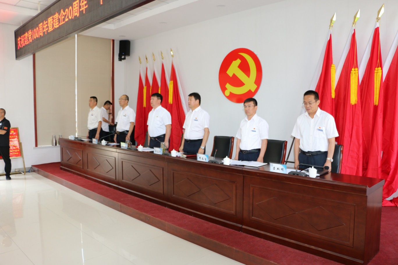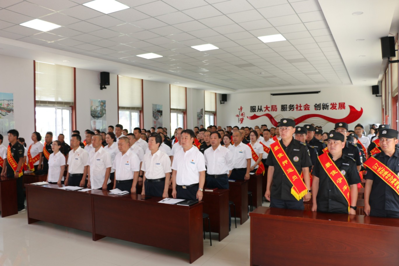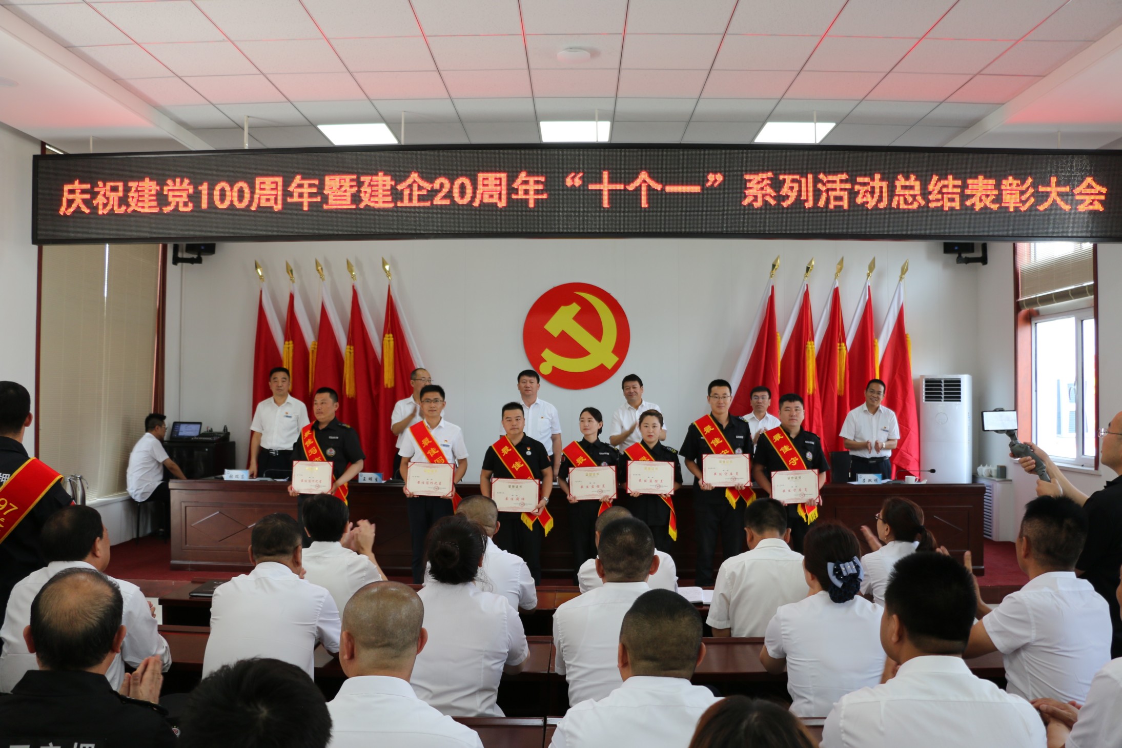為熱烈慶祝中國共產(chǎn)黨成立100周年,頌揚(yáng)黨的光輝歷程,謳歌黨的豐功偉業(yè),傳承黨的優(yōu)良傳統(tǒng)和回顧公司發(fā)展歷程,不斷激發(fā)和進(jìn)一步激勵廣大黨員、干部職工統(tǒng)一意志、團(tuán)結(jié)拼搏,創(chuàng)先爭優(yōu)的奮斗熱情,實(shí)現(xiàn)公司更好更快發(fā)展、全面完成全年各項(xiàng)目標(biāo)任務(wù),6月30日上午,中共山西大正保安服務(wù)集團(tuán)有限公司委員會隆重召開慶祝建黨100周年暨建企20周年“十個(gè)一”系列活動總結(jié)表彰大會,公司班子成員、中層以上領(lǐng)導(dǎo)、受表彰的先進(jìn)集體代表和先進(jìn)個(gè)人、2020—2021年度新發(fā)展黨員共計(jì)160余人參加會議,大會由集團(tuán)公司黨委委員、副總經(jīng)理王明生同志主持。
