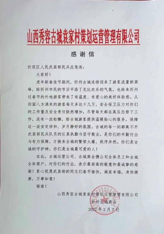 感謝信中,山西秀容古城袁家村策劃運(yùn)營(yíng)管理有限公司和忻州古城商會(huì)對(duì)物業(yè)公司民兵應(yīng)急連在春節(jié)期間面對(duì)古城客流量增大,隊(duì)員們堅(jiān)守崗位,圓滿完成安保任務(wù)給與了充分肯定和表示了崇高敬意,并致以衷心感謝和衷心祝愿!