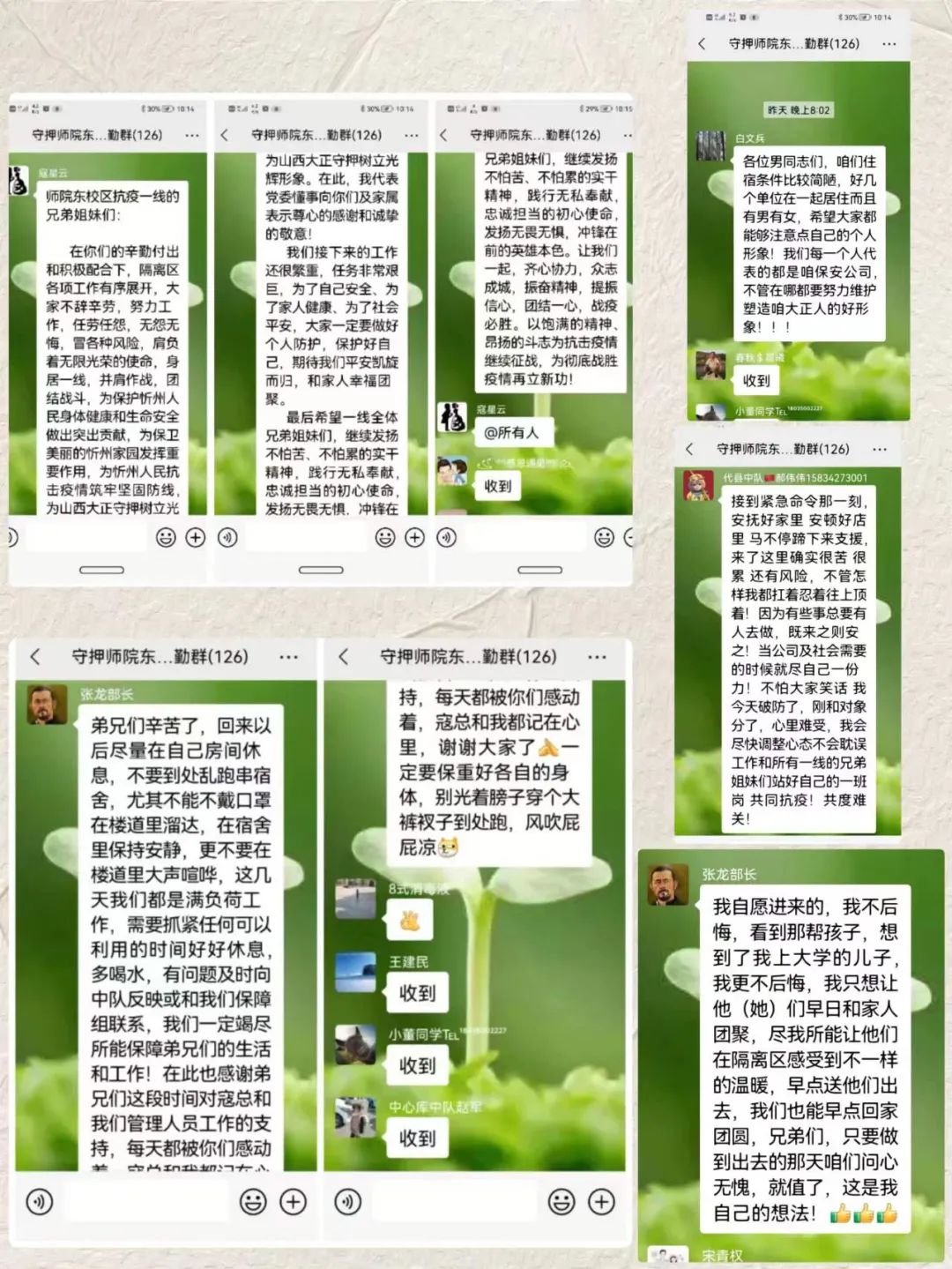 忻州師院東校區(qū)隔離點正式啟用后,寇星云、郭二平分別帶領(lǐng)以守押公司、億通公司人員為主組建的工作區(qū)、隔離區(qū)兩支黨員突擊分隊進駐相應(yīng)區(qū)域,以機關(guān)和守押監(jiān)控中心、物業(yè)公司、刻章公司、億通公司、文化藝術(shù)公司等單位人員組建的其它三支黨員突擊分隊在外負責(zé)保障餐食、物資供應(yīng)。餐食物資保障分隊隊員既要克服重重困難采購所需食材和生活物資、合理搭配菜譜,又要在保溫、包裝等方面想辦法、下功夫,盡量根據(jù)隔離人員不同口味做到差異化安排搭配,保證葷素搭配、營養(yǎng)均衡,盡最大程度滿足隔離人員每日的營養(yǎng)需求。預(yù)備應(yīng)急分隊隊員往往身兼數(shù)職,哪里需要到哪里,一會幫忙搬運物資,一會幫忙分裝水果、面包、餅干等輔食,忙的馬不停蹄。餐食物資運輸隊員根據(jù)實際,科學(xué)合理調(diào)配車輛和路線,保證將餐食、生活物資按時送達。在隔離點一線的工作區(qū)、隔離區(qū)隊員,在做好餐食、物資配送的基礎(chǔ)上,積極協(xié)調(diào)解決隔離人員的合理訴求,讓隔離點如家般溫暖常在,做到了隔離人員、工作人員、隔離點領(lǐng)導(dǎo)組“三滿意”。