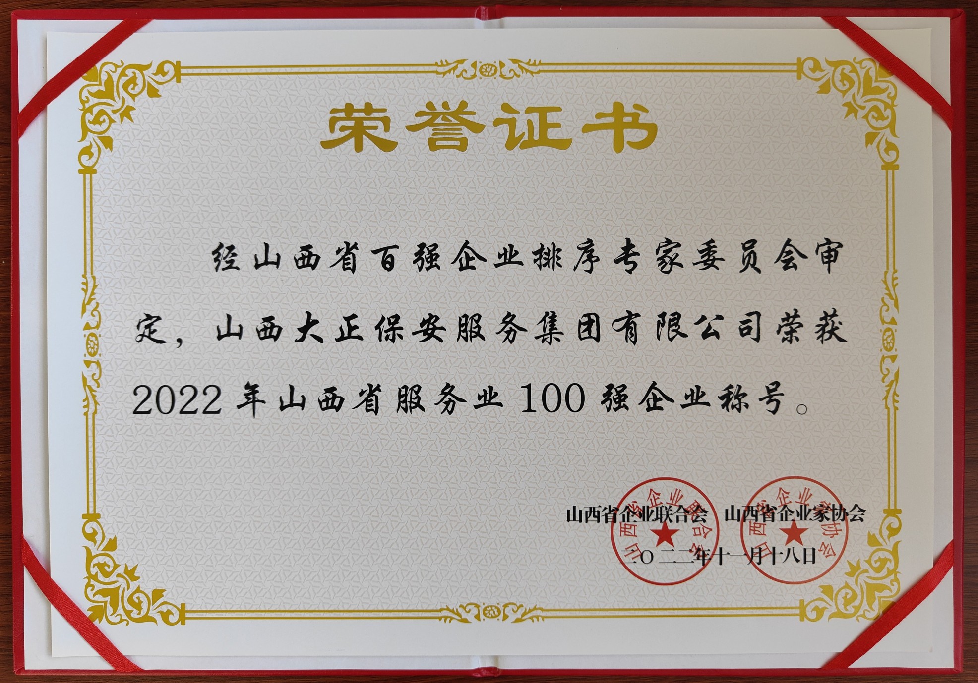 12月20日,山西省企業(yè)聯(lián)合會、山西省企業(yè)家協(xié)會召開第30次年會暨2022山西企業(yè)100強(qiáng)發(fā)布會。山西大正保安服務(wù)集團(tuán)有限公司入圍“2022山西服務(wù)業(yè)企業(yè)100強(qiáng)”、榮獲“2020-2021年度優(yōu)秀企業(yè)”稱號,黨委副書記、總經(jīng)理趙培宏榮獲“2020-2021年度優(yōu)秀企業(yè)家”稱號。