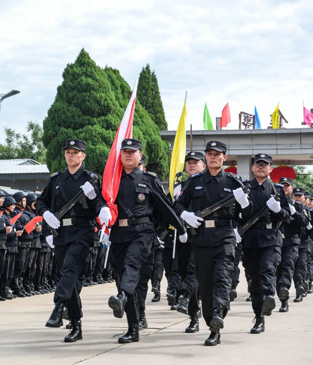 節(jié)日的公司院內(nèi)外,四周花團(tuán)錦簇,大門口燈籠高掛、彩旗飄揚(yáng),為節(jié)日增添了濃厚的喜慶氛圍。公司運(yùn)鈔車、巡邏車、運(yùn)兵車干凈整潔,排列在場地兩側(cè),升旗儀式更顯隆重。9時(shí)30分,集團(tuán)公司、各子公司領(lǐng)導(dǎo)和機(jī)關(guān)各部門、城區(qū)員工共300多人整齊列隊(duì),懷著激動(dòng)的心情,手持小國旗,臉上貼著愛國貼紙、洋溢幸福的笑容,眼神中充滿了對祖國的熱愛和對升旗儀式的期待。
