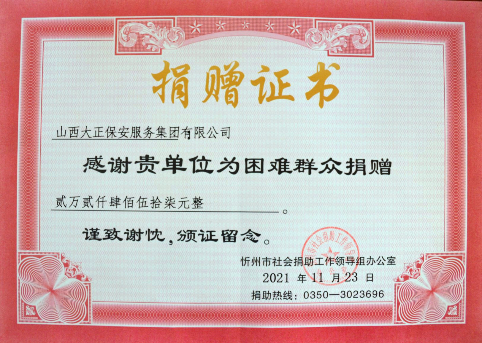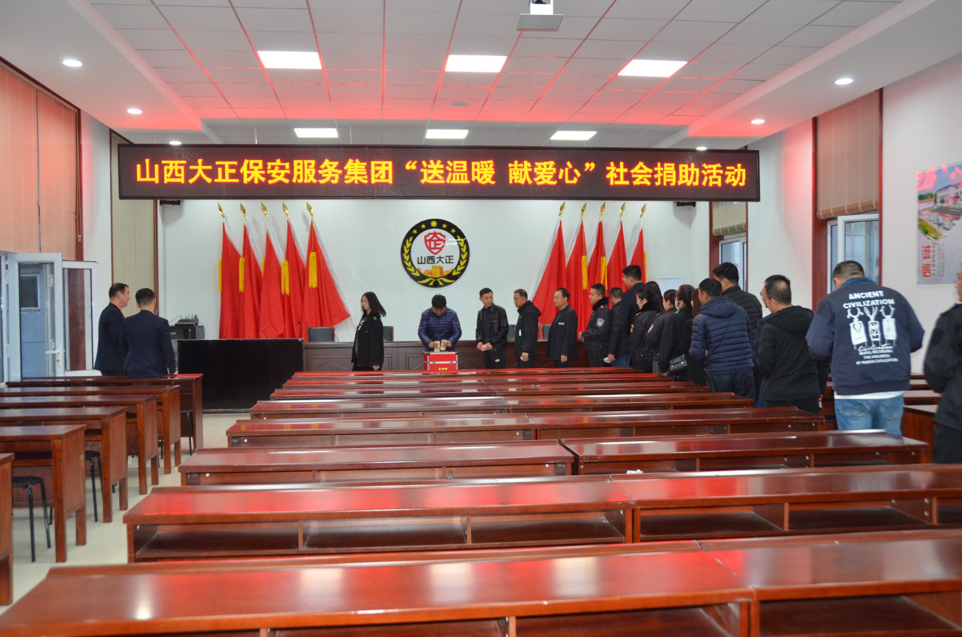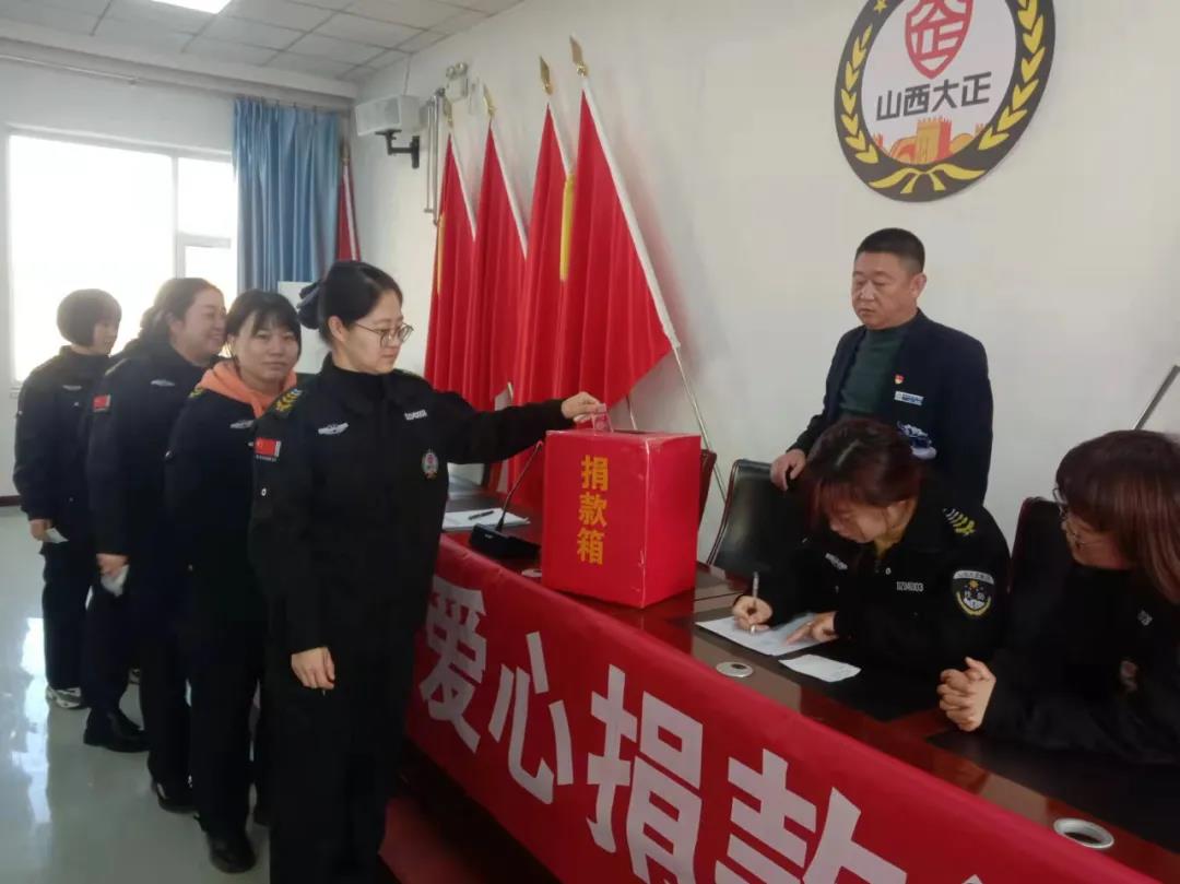 11月15日,集團公司組織領(lǐng)導班子成員及總部駐地全體員工在大會議室參加了社會捐助活動。本次捐助活動,彰顯了山西大正保安集團廣大員工的奉獻擔當精神,也激發(fā)了公司全體員工扶危濟貧的愛心,在全公司上下營造了無私奉獻、助人為樂的濃厚氛圍。
