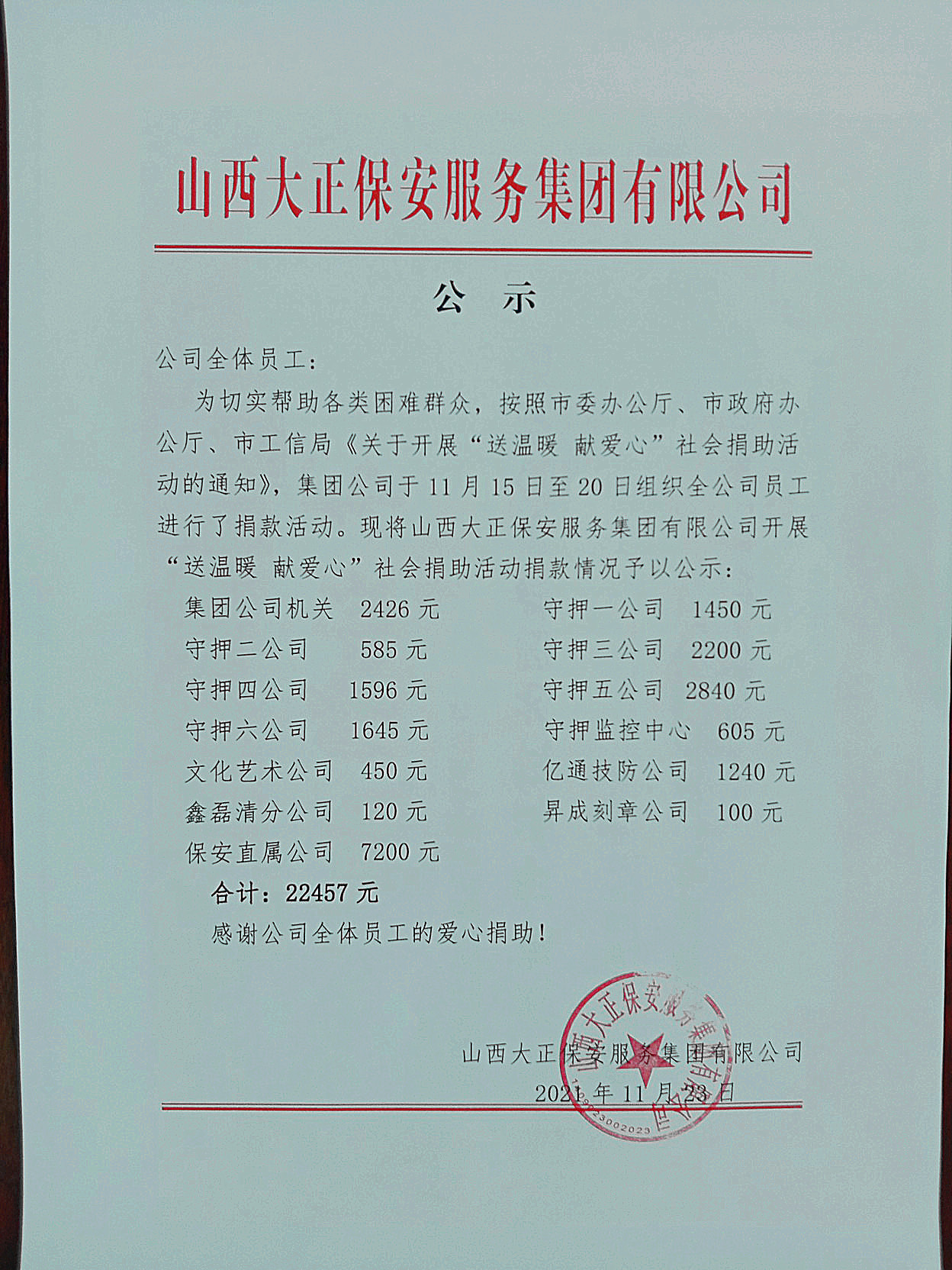 與此同時,公司基層各級黨組織和黨員領(lǐng)導干部充分發(fā)揮表率作用,帶頭宣傳動員,帶頭捐款獻愛心,以實際行動影響和帶動廣大干部職工在各所屬駐地相繼踴躍開展、參與了捐助活動。一筆筆捐款,代表著山西大正保安集團廣大職工的一份份愛心,詮釋著大正保安人對社會的拳拳愛心,短短幾天時間,我公司共收到員工社會捐款22457元。