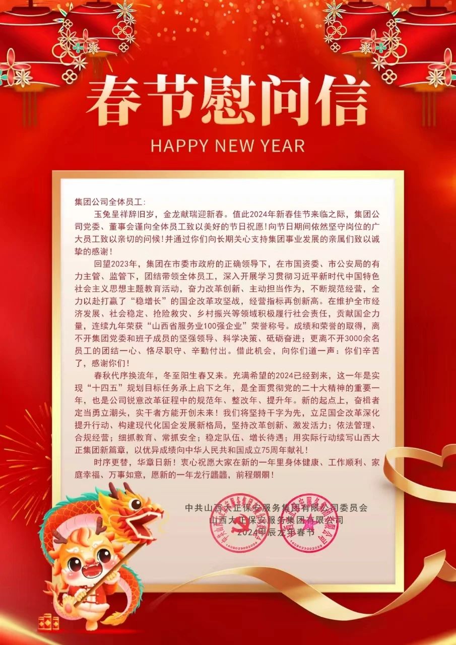 玉兔呈祥辭舊歲,金龍獻瑞迎新春。值此2024年新春佳節(jié)來臨之際,集團公司黨委、董事會謹(jǐn)向全體員工致以美好的節(jié)日祝愿!向節(jié)日期間依然堅守崗位的廣大員工致以親切的問候!并通過你們向長期關(guān)心支持集團事業(yè)發(fā)展的親屬們致以誠摯的感謝!