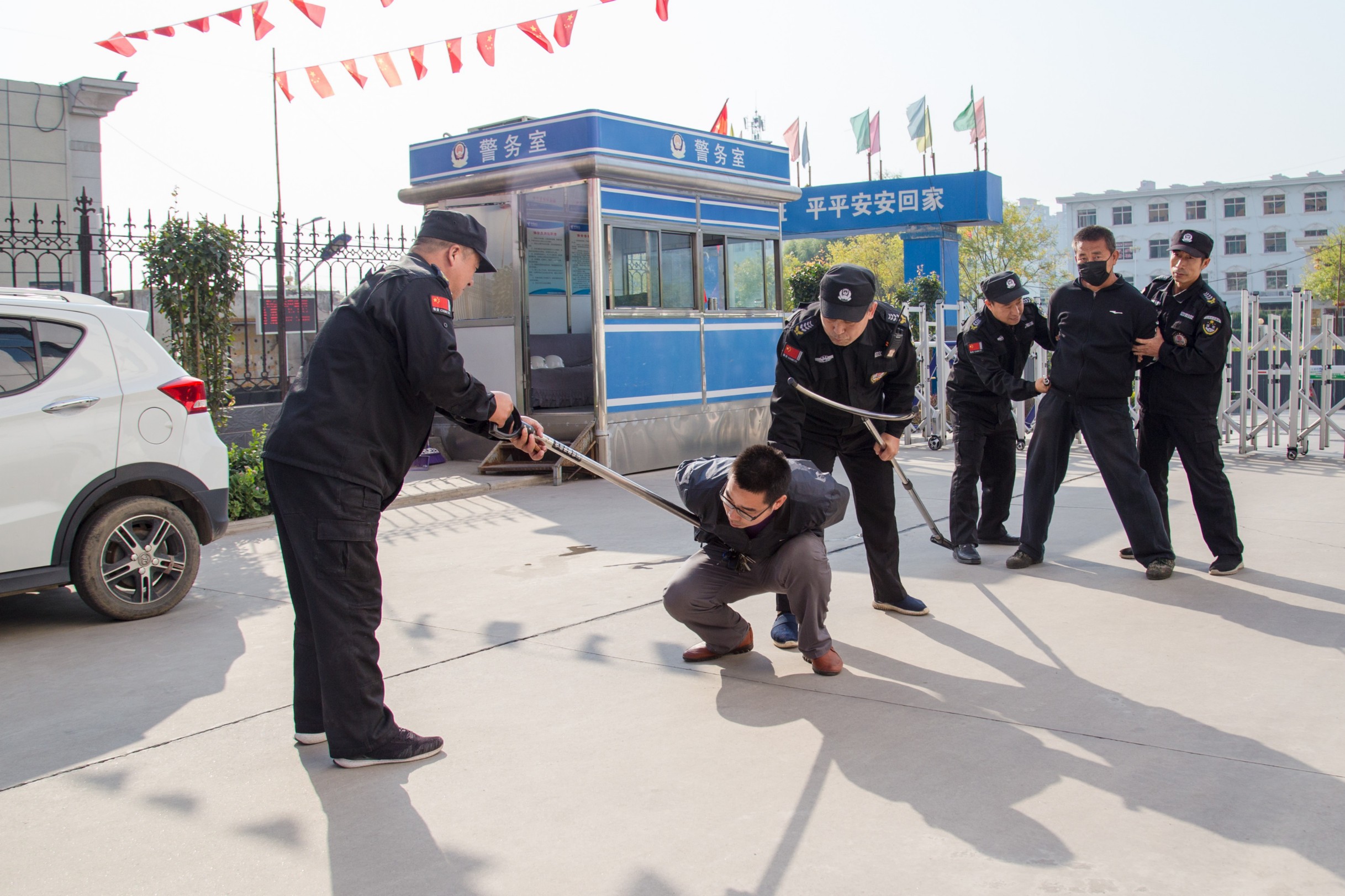 演練開(kāi)始后,路邊車上下來(lái)四名歹徒,手持棍棒沖向大門,門衛(wèi)及時(shí)關(guān)閉大門,并用對(duì)講機(jī)呼叫執(zhí)勤保安,各小組收到信息后,手持防爆工具及時(shí)趕赴現(xiàn)場(chǎng),互相配合,大家齊心協(xié)力把歹徒制服。